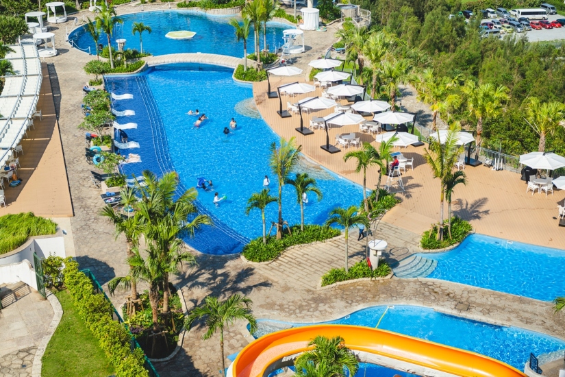 夕暮れ時より色鮮やかなライトが木々を照らしだし、幻想的なナイトプールが浮かび上がる。