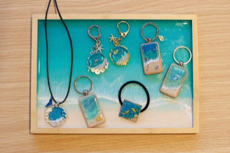 Create your own Okinawan ocean-inspired accessory capturing the color of the ocean blue hues and shimmering waves. Choose from keychains, necklaces, or hair ties. Even beginners can easily create these accessories, so anyone is welcome!