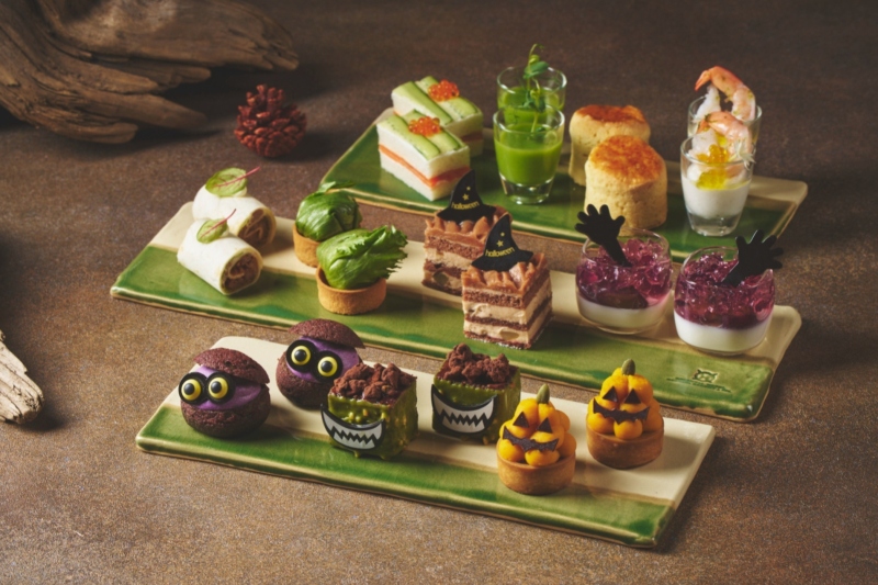 Our Halloween sweets for October feature Pumpkin Tart and Sweet Potato Cream Puffs decorated with spooky designs.