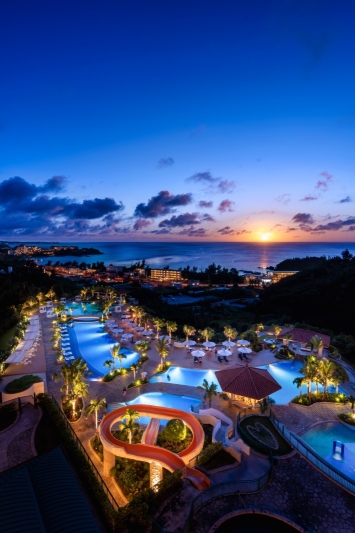 海を見渡す緑豊かな丘の上、南国らしい木々に囲まれ、弧を描くように広がる全長170mのガーデンプールは、雄大な東シナ海を一望できる絶好のロケーションを誇ります。オープンデッキから眺めるサンセットは格別。夜を迎えると、水面の煌めきと木々の幻想的なライトアップが、優雅なバカンスタイムを演出します。